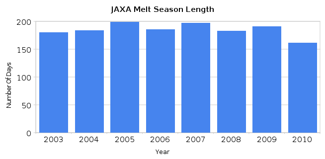 It appears that the JAXA extent graph has bottomed out. If so, the melt season (date of the minimum minus the date of the maximum) in 2010 was the shortest in their eight year record, at 163 days. The previous record was 181 days in 2003. The longest melt season was 2005, at 200 days.