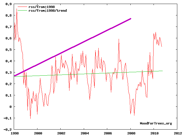 I drew a 5C/century trend (purple) on top of the actual decadal trend (green – measured El Nino peak to peak.)