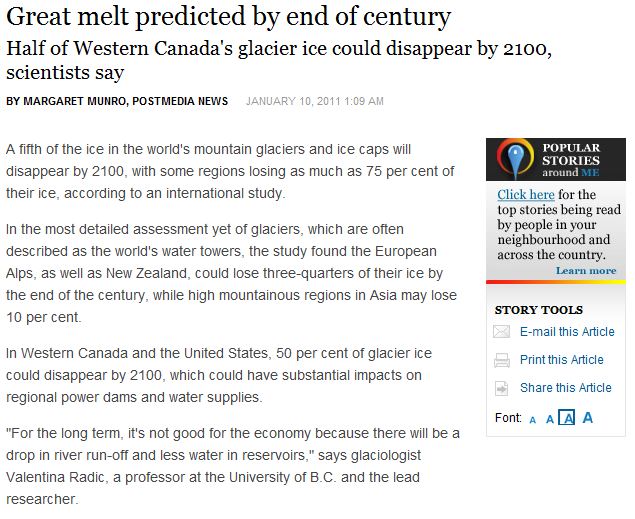 If melting icecaps are going to be causing colder, snowier winters in the northern temperate zones (as the AGW spin doctors are now telling us), shouldn’t this be causing glaciers to be expanding?