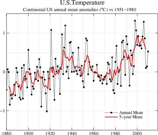 I am sure this has been mentioned before, but it is one of my pet peeves. In the original , the scale of the US temperatures goes from -1.5 to 1.5 C, but the world temp graph goes from -0.6 to 0.6 C. It doesn’t really make any difference in what they are trying to say (one would expect larger variations on the regional scale compared to the global average). So why do it?