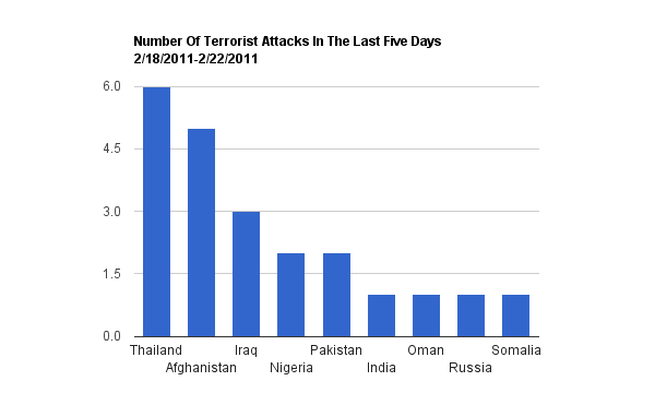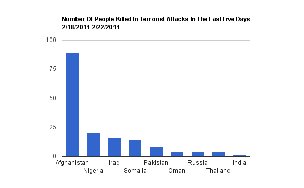 Not counting official government terrorism in Libya and elsewhere, here are the terrorist stats for the last five days.