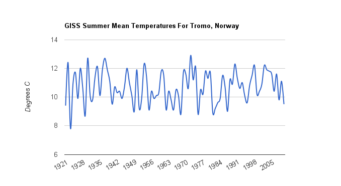 GISS reports that the average temperatures in Tromo, Norway during July and August, 1922 – were a cool 14.8 and 11.9 C.