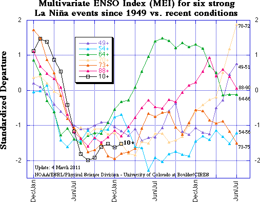 Stay tuned for the next update (by April 9th, or earlier) to see where the MEI will be heading next. While La Niña conditions are guaranteed well into 2011, it remains to be seen whether it will indeed last into 2012, as discussed seven months ago on this page. I believe the odds for a two-year event remain well above 50%, notwithstanding the possibility of temporary weakening during boreal summer. During the next few months, the MEI may very well stay stronger than Niño 3.4 since the latter is not normalized to account for weaker variability during this time of year.