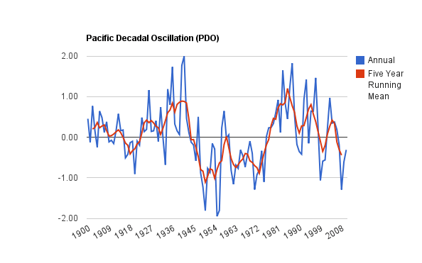 My no doubt simplistic understanding of PDO is that a positive PDO is marked by an above average incidence of El Nino and a negative by La Nina.