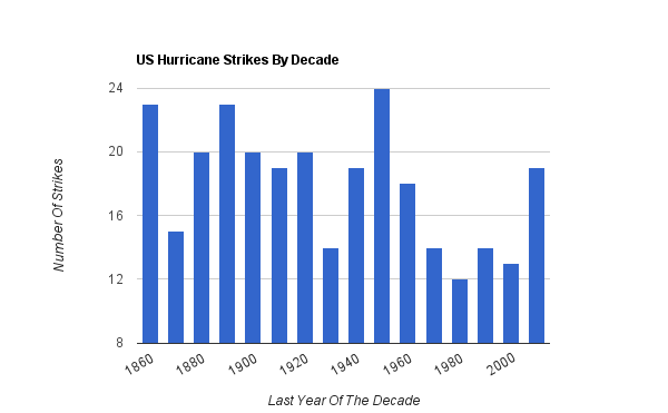 The last 50 years have been relatively quiet for hurricane activity in the US. Prior to 1960, the US averaged 20 hurricane strikes per decade, or two per year. Since 1960, the US has averaged 14 hurricane strikes per decade, or 1.4 per year. i.e prior to 1960, the US received nearly 50% more hurricanes per year than during the last 50 years.