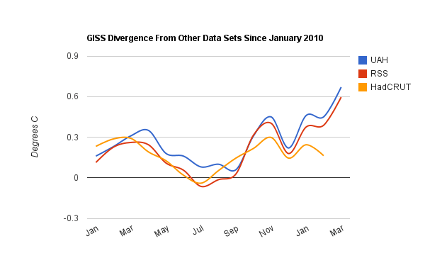 Since last summer, GISS has been diverging from satellite data at a rate of over 50C per century. Hansen claimed a record last year by 0.01C – with an error 500X times greater than his claim.