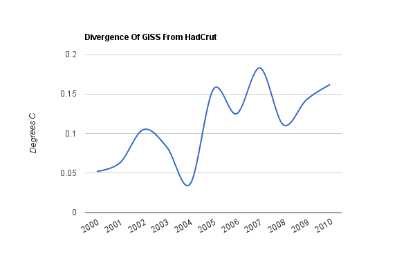 Since 2000, GISS has been diverging from HadCRUT at a rate of 1C per century
