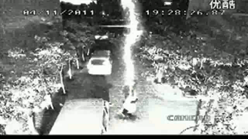 Dollars to donuts says that the original unedited film simply shows someone falling over twice. Then for each of the frames where he falls, they’ve jacked up the brightness and contrast of the frame and then drawn in the lightning bolts.