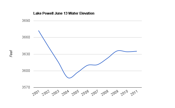 The decline in Lake Powell water levels ended in 2004, and the lake is currently gaining more than one foot elevation per day – with record snowpack remaining in the mountains upstream.