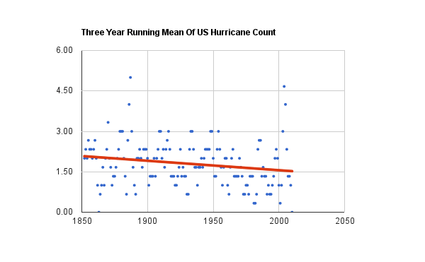 As CO2 has increased, the number of hurricane strikes has decreased.