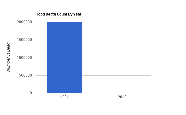 2010/2011 saw over 1,000 people die in floods around the planet, prompting many alarmists to claim that the extreme weather is unprecedented. The graph below compares 2010 vs. 1931 – when more than two million people died in floods.