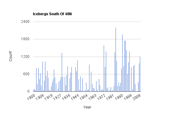 A bit late in commenting, but the US Coast Guard’s International Ice Patrol database no longer exists at it’s website. The link you gave does not work. It appears to have been subsumed by the National Snow & Ice Data Center (NSIDC). However, of the 1900-2009 IIP’s data you plotted only 3% or so has been derived from satellites, and these were commercial. Satellites don’t produce more icebergs.