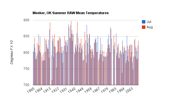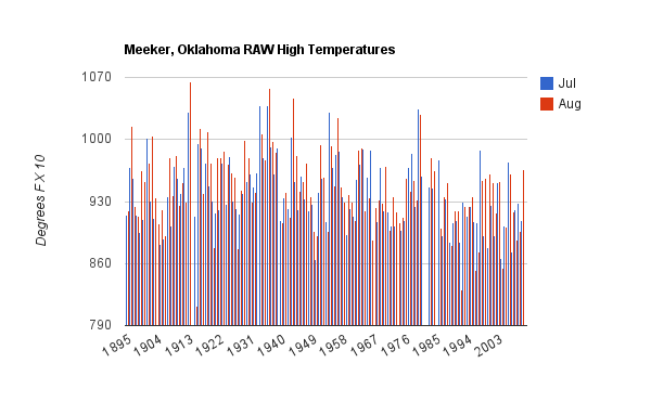 The closest USHCN station is in Meeker, OK. August 1936 averaged one degree warmer at 90F, and summer temperatures have steadily declined since the 1930s.