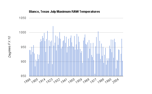The closest USHCN station to Austin is at Blanco. July maximum temperatures have declined about five degrees since the 1920s.