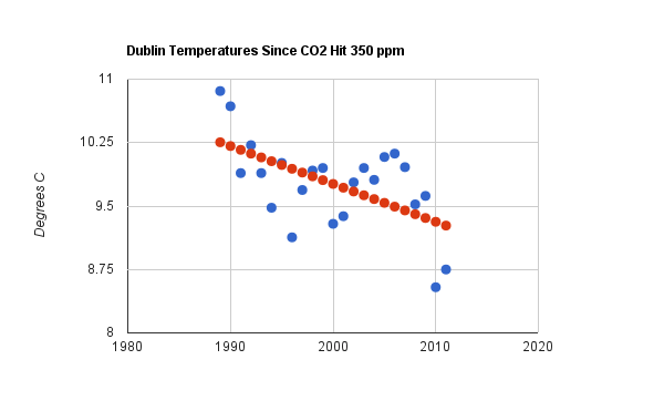 Since the Earth hit 350 ppm, temperatures in Dublin have been falling faster than four degrees per century.