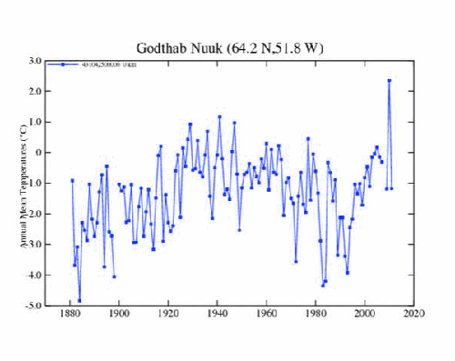 CRUTEM4v shows that the grid cell which Nuuk, Greenland is located on, has no temperature trend over the last 100 years. GISS used to show the same thing, but Hansen recently corrupted the Nuuk temperature data to show a warming trend – which never actually occurred.