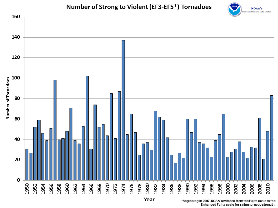 It is interesting to note that despite all the angst and hand wringing about last year’s severe tornadoes, 2011 did not even rank in the top five for number of severe tornadoes.