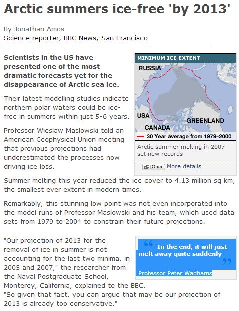 To be honest, Peter Wadhams actually said this in 2007: “…In the end, it will just melt away quite suddenly. It might not be as early as 2013 but it will be soon, much earlier than 2040…”