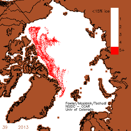 The amount of five year old ice in the Arctic has more than doubled over the past two years, as seen in the animation below.