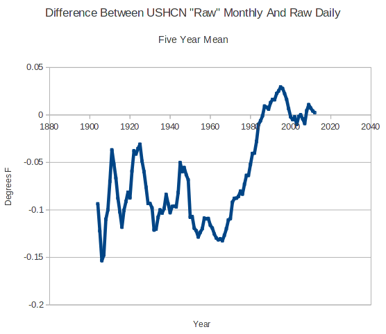But it is worse than it seems. Before they even to get to “raw monthly” data, they have already cooled the past by 0.1ºF relative to their raw daily data.