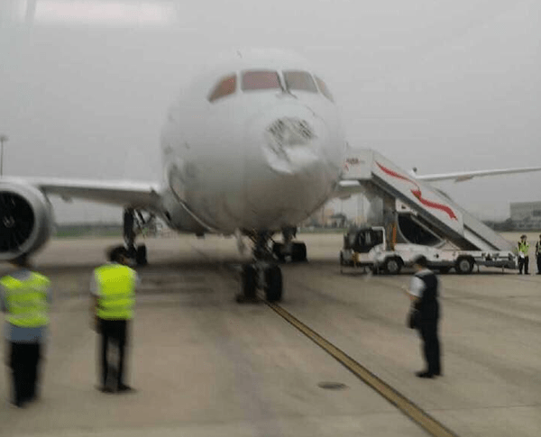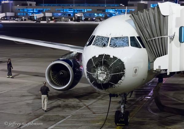 Although cockpit screen damage is an event that occurs to almost every Aircraft in its life cycle, this has to be amongst the worst I’ve seen. Nose cone damage to that extent is rare; I bet the leading edges are peppered badly. The engines and flight dynamics must also have been compromised ; great respect for the pilots…
