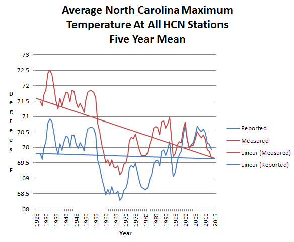 Maximum temperatures in North Carolina have plummeted almost two degrees over the past century. This wrecks their theory, so the fraudsters at NOAA simply made the decline disappear.