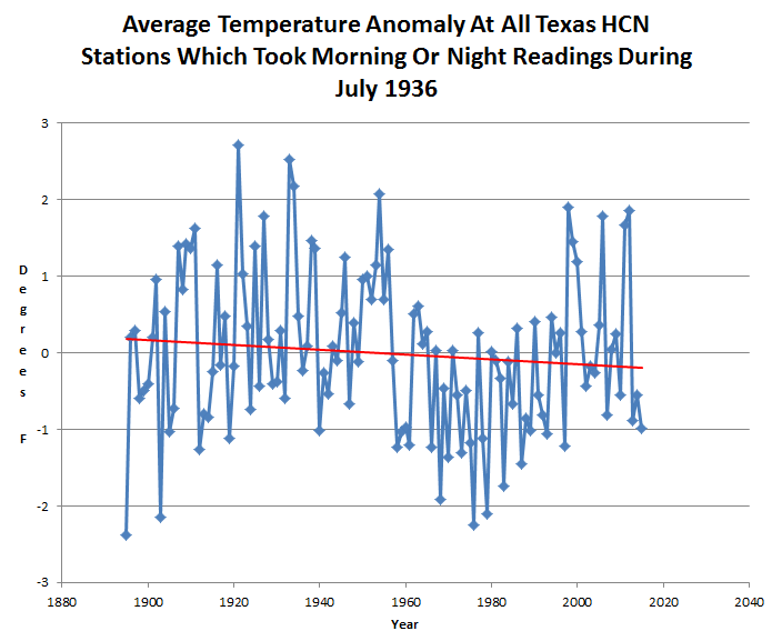 That theory is easy to test out. The graph below uses only those stations which reset their thermometers at night or morning during July 1936. As you can see, it is almost identical to the top graph for all Texas stations. TOBS has almost no effect on Texas temperatures.