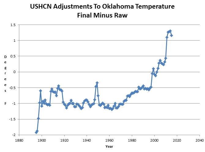 Temperatures In Oklahoma have declined half a degree since 1895. The fraudsters at NOAA didn’t like the decline, so they simply made it disappear.