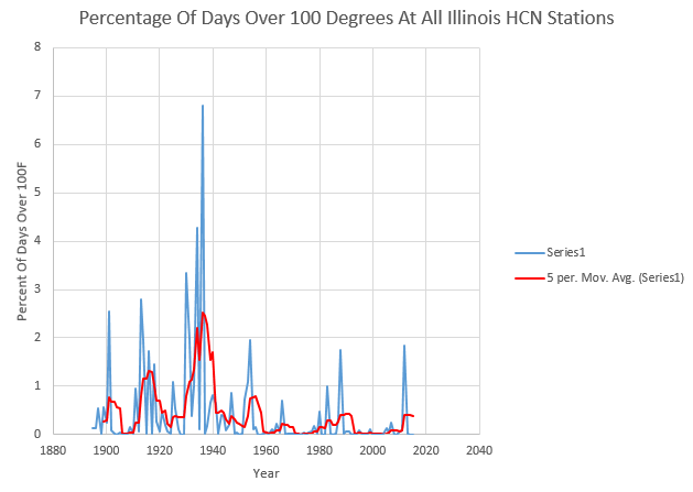 Prior to 1960, 100 degree days were very common in Illinois, but they rarely happen any more.