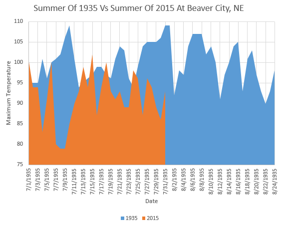 During the summer of 1935, Beaver City, NE had 55 consecutive days over 90 degrees, including many days over 105 degrees. This past summer (which NOAA says was the hottest ever) averaged about 10 degrees cooler than 1935.
