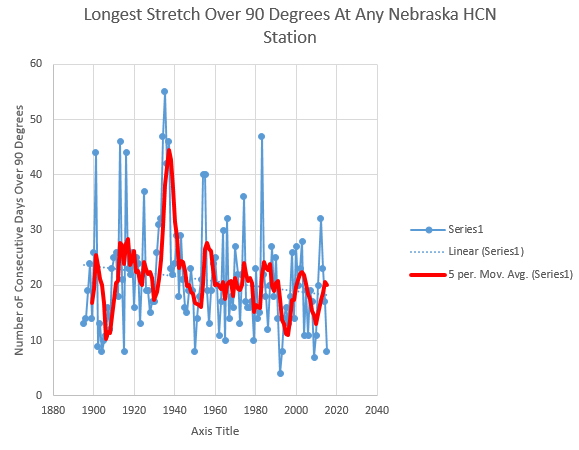Nebraska used to have frequent long heatwaves, but they rarely happen any more. The years 1934, 1935, 1936 and 1937 all had stretches over 90 degrees for more than 40 consecutive days.