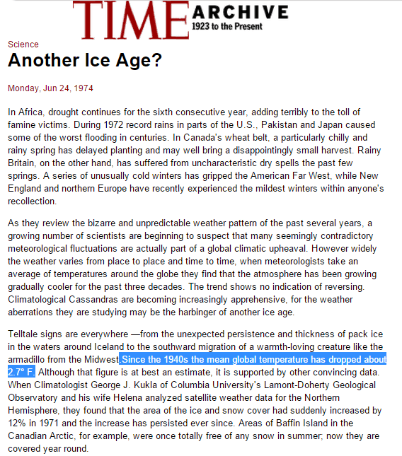 In 1974, Time Magazine reported 2.7 degrees cooling since the 1940’s, and a large increase in snow and ice cover.