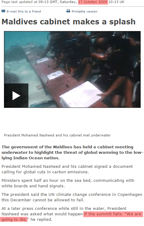 In 2009, the Maldives realized they could collect climate scam money from the US, and announced they were going to die if they didn’t get the money.