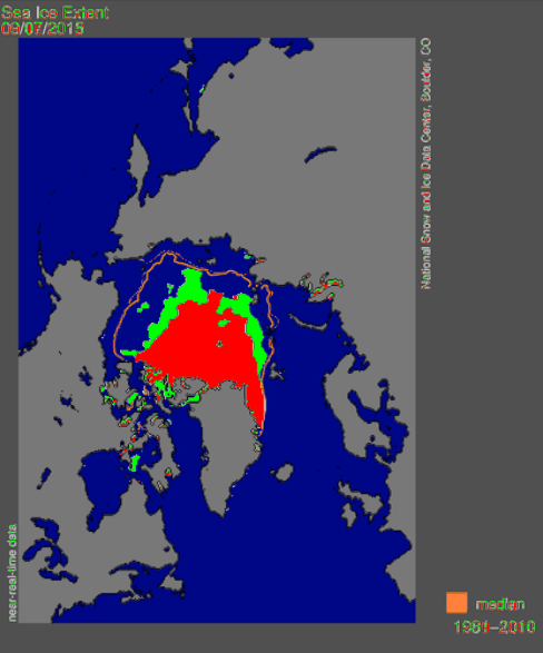 I appreciate your proactive approach, lectrikdog. The image that you reposted came with the seemingly satirical headline is what lured me here. Yes, I can see the red area in which the Arctic extent was in 2012 (3.517 mil sq km, the record low year). And yes, I can see the green area of 2015 (4.460 mil sq km). What I take issue here is that (Goddard) seems to be ignoring the orange line in what is known as the median (indicated in the lower right corner of the graph). This is where the Arctic average WAS (6.327 mil sq km), almost 2 million square kilometers below the average. The headline he chooses seems to suggest that 2012 is the norm for what the Arctic ice extent should be, which it isn’t. To cut to the chase, the Arctic hasn’t “gained” anything: it just hasn’t melted as much as it did in 2012 and will likely be a forth lowest on record. The fact that the melt season doesn’t usually stop until roughly September 17-20 makes this claim even more perplexing.