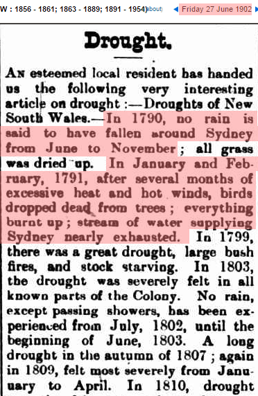 Obviously a TOBS issue, if nobody had been observing precipitation values in 1790, this would not have been reported. Besides, people back then were stupid and did not know the difference between rain and sunshine. We just need a single tree in Siberia to really know what happened in Sydney 225 years ago.
