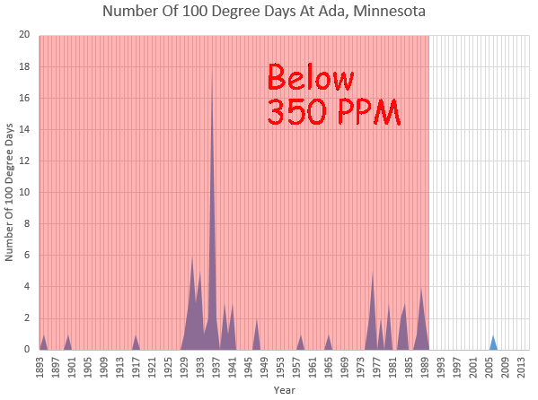 One hundred degree days were very common in Ada when CO2 was below 350 PPM, but they almost never happen any more. There has only been one 100 degree day in Ada since 1988. but in 1936 they had twelve consecutive 100 degree days and eighteen during the summer.