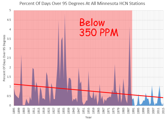 For the entire state of Minnesota, the frequency of hot days has plummeted over the past 120 years. Since CO2 hit 350 PPM, they rarely have 95 degree days any more.