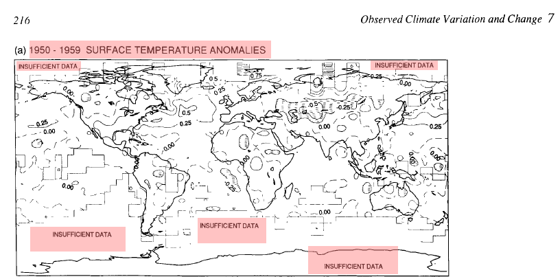 In the 1990 IPCC report, they showed that there was insufficient temperature data for analysis in much of the Arctic, most of the southern oceans, and all of the Antarctic.