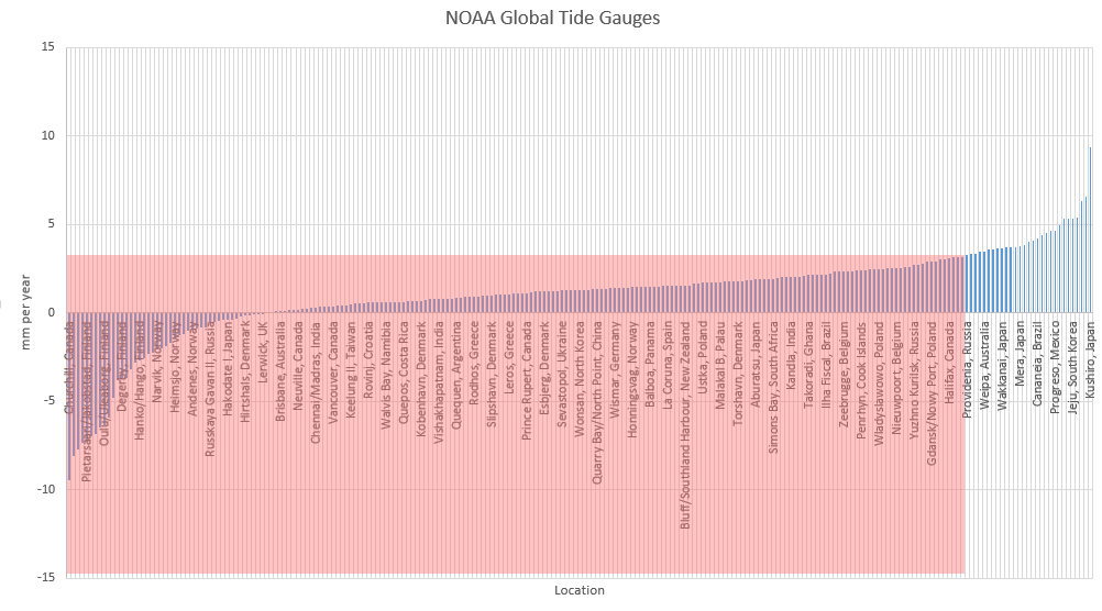 The EPA and CSIRO must be measuring a different planet. I wrote a paper in 2013 using the PSMSL tide gauge dataset. While the average trend from 1866 to 2010 was 1.2 mm/year, the trend from 1950 through 1979 was 2.06 mm/year. The trend from 1980 to 2010 was 1.39 mm/year. This agrees fairly well with the findings of Beenstalk et. al., (2013) “Tide Gauge Location and the Measurement of Global Sea Level Rise”