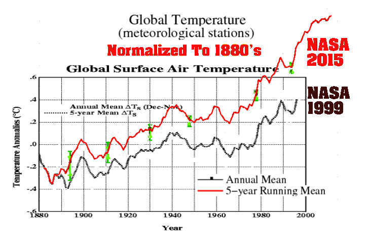 That is pretty spectacular fraud, and they have done exactly the same thing with their sea level data since 1982. NASA currently shows 16 cm of sea level rise from 1880 to 1980, and no change in rates over time