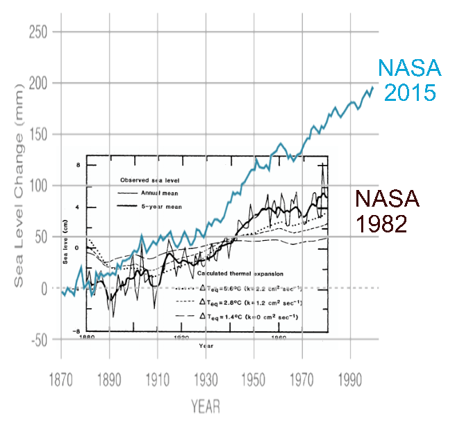 NASA’s current graph looks nothing like their 1982 graph, doubling sea level rise. Exactly the same thing they have done with temperature rise.