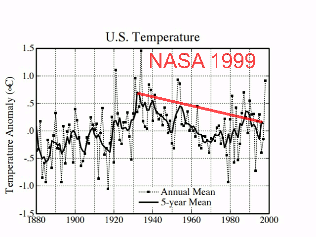 “In 1999, NASA’s James Hansen wrote that the US was cooling, even as greenhouse gases rapidly increased.”