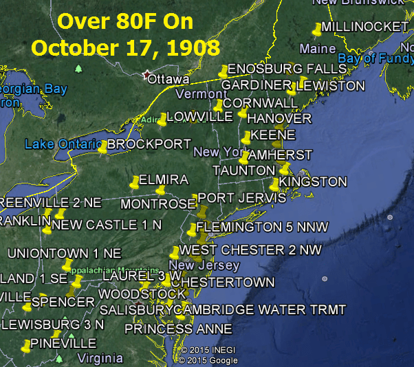 The 1908 heatwave was not localized to Massachusetts. Laurel, MD was also 90 degrees on this date in 1908. Most of the Northeast reached 80 degrees, and many stations reached 85 degrees.