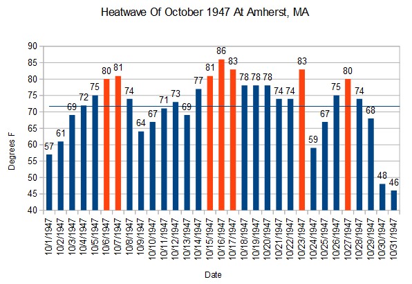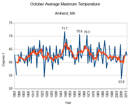 The warmest October in Amherst was 1947, which had seven afternoons over 80 degrees, and averaged almost 72 degrees.