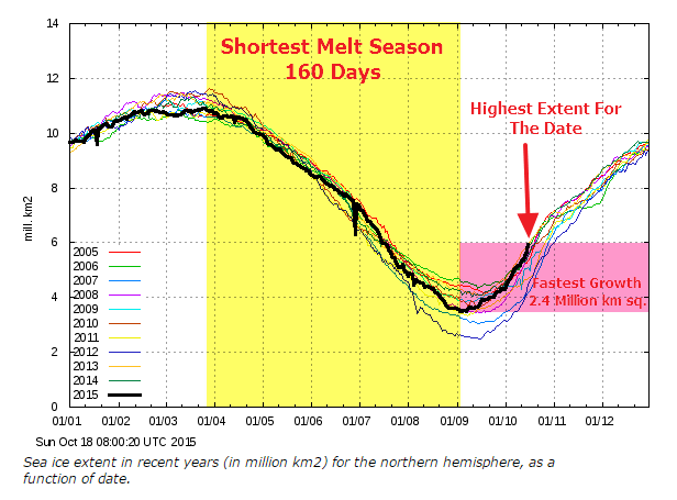 After the shortest melt season on record, and the most rapid growth on record, Arctic sea ice extent is the largest in a decade.