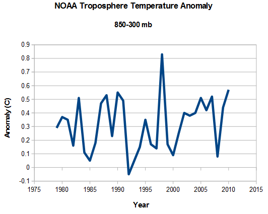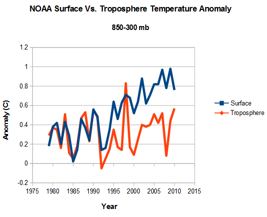 Due to Urban Heat Island Effects, the NOAA surface data shows nearly one degree warming from 1979 to 2010, but their original radiosonde data showed little warming during that time. Global warming theory is based on troposphere warming, which is why the radiosonde data should be used by modelers – instead of the UHI contaminated surface data.
