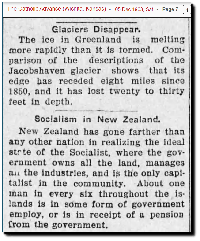 By 1903, glaciers were rapidly disappearing around the world and New Zealand had gone full socialist. According to the IPCC and Michael Mann, the second half of the 19th century was the coldest fifty years of the last millennium.